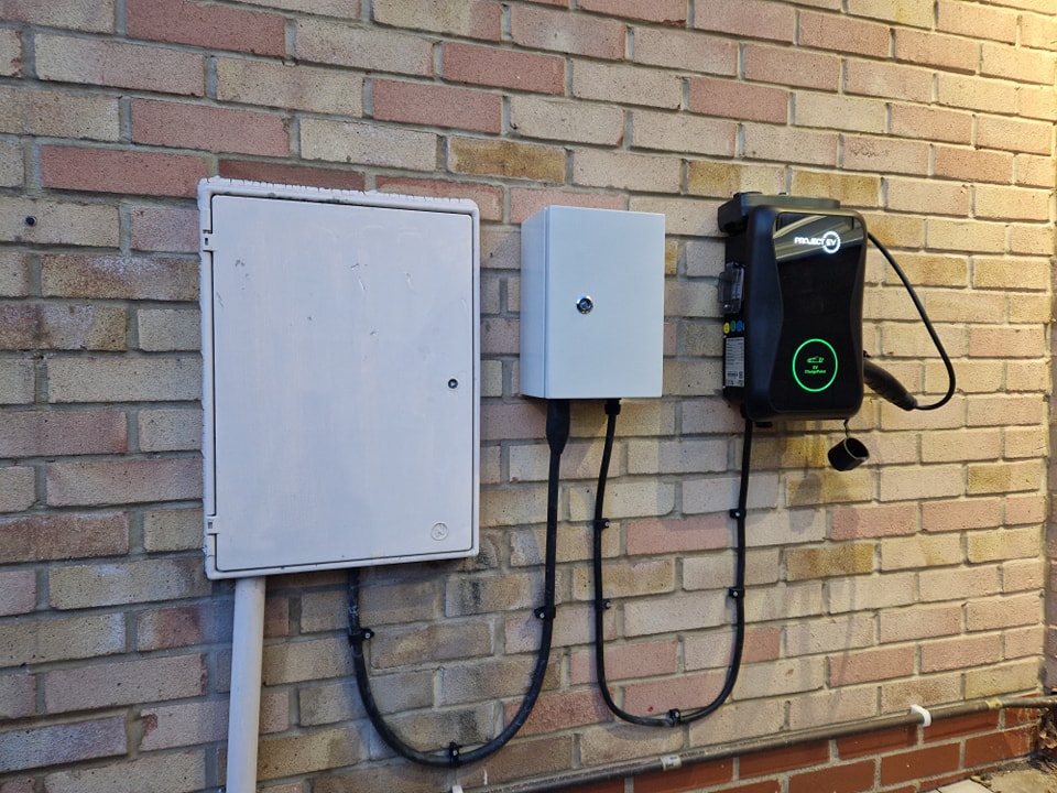 We installed a small weatherproof enclosure next to the DNO meter box to house a small consumer unit and mounted an untethered 7.3Kw project EV charge point next to it with all the cabling clipped direct to the surface as neatly as possible.